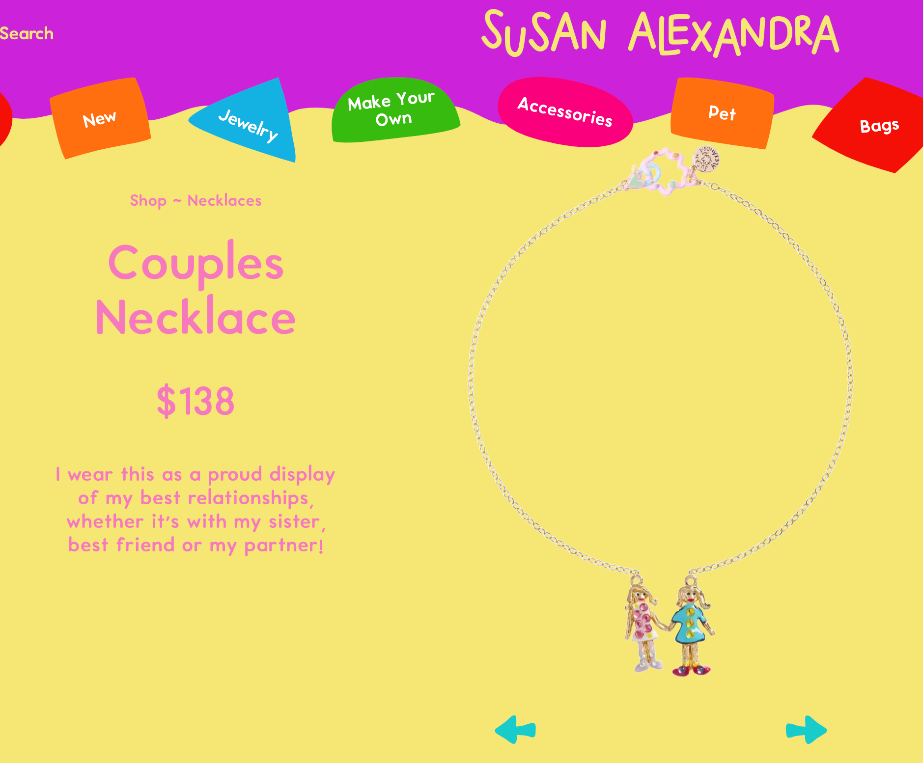 For your beloved Portlandia episode of a sister, Susan Alexandra has created a necklace. Susan is a jewelry maker who is also a vintage treasure hunter with a sense of humor and whose sparklemania shop on Orchard Street truly looks like a cavern of antique tchotchkes (go in person, trust me). She is very much on your sister’s wavelength, and has created the perfect item for a sister to give a sister: A couple’s necklace. She will laugh and smile and it is also so cool and cute and layer-able and gorgeous and detailed and silly and she’s going to love it.