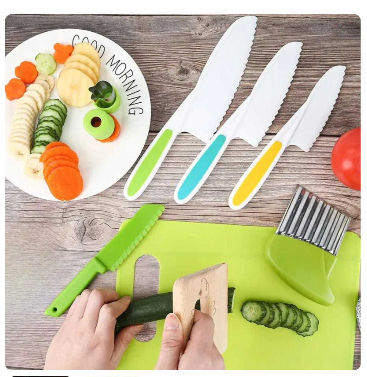 You’re also going to get her this Montessori knife set for kids, which my own children use, and has revolutionized the amount of help (and joy/pride in accomplishment) they have in the kitchen. If she’s not going to get down on the ground to play with the grandchildren, have them get up to the counter to help her, for crying out loud.