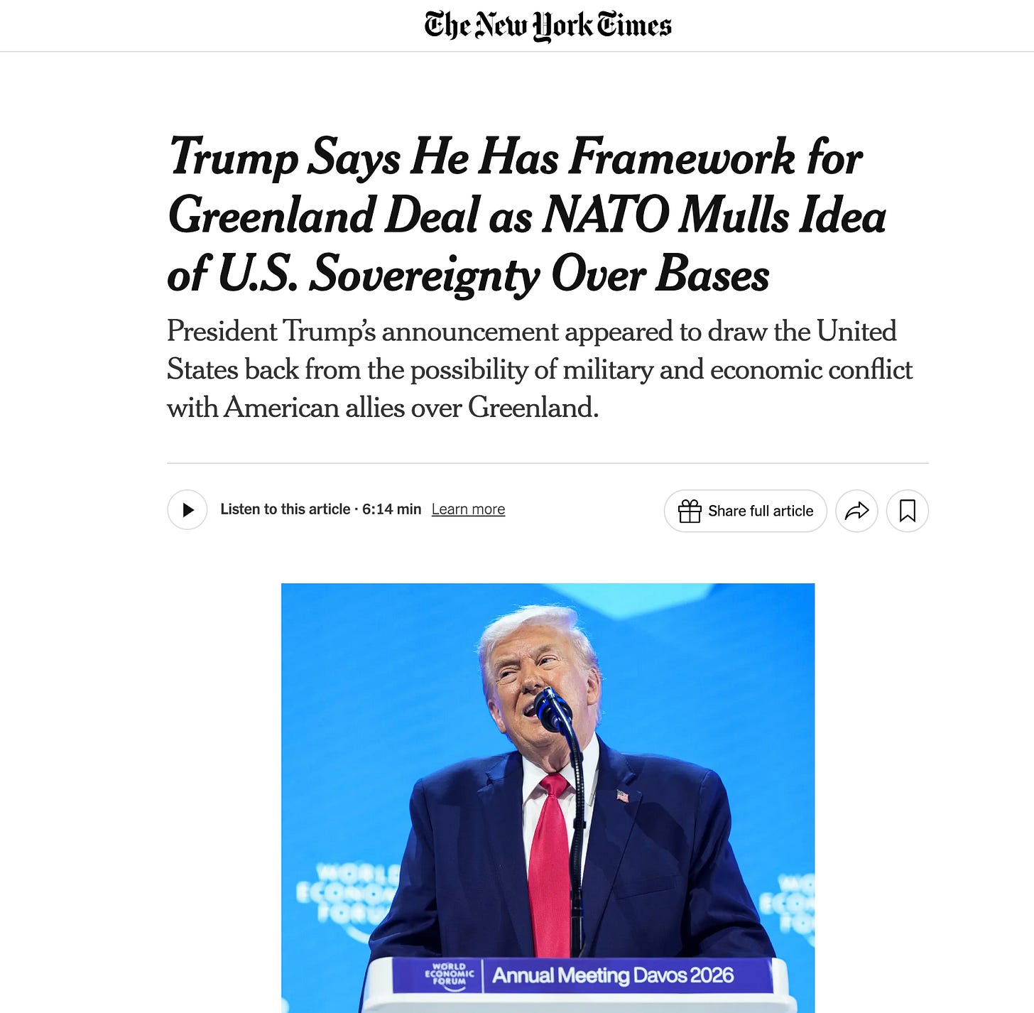 Unbelievably, mere hours later, Trump announced his administration had reached a deal with NATO that would outline a framework of a deal that would give the United States sovereignty over military bases in Greenland, which would remain an autonomous territory of Denmark.